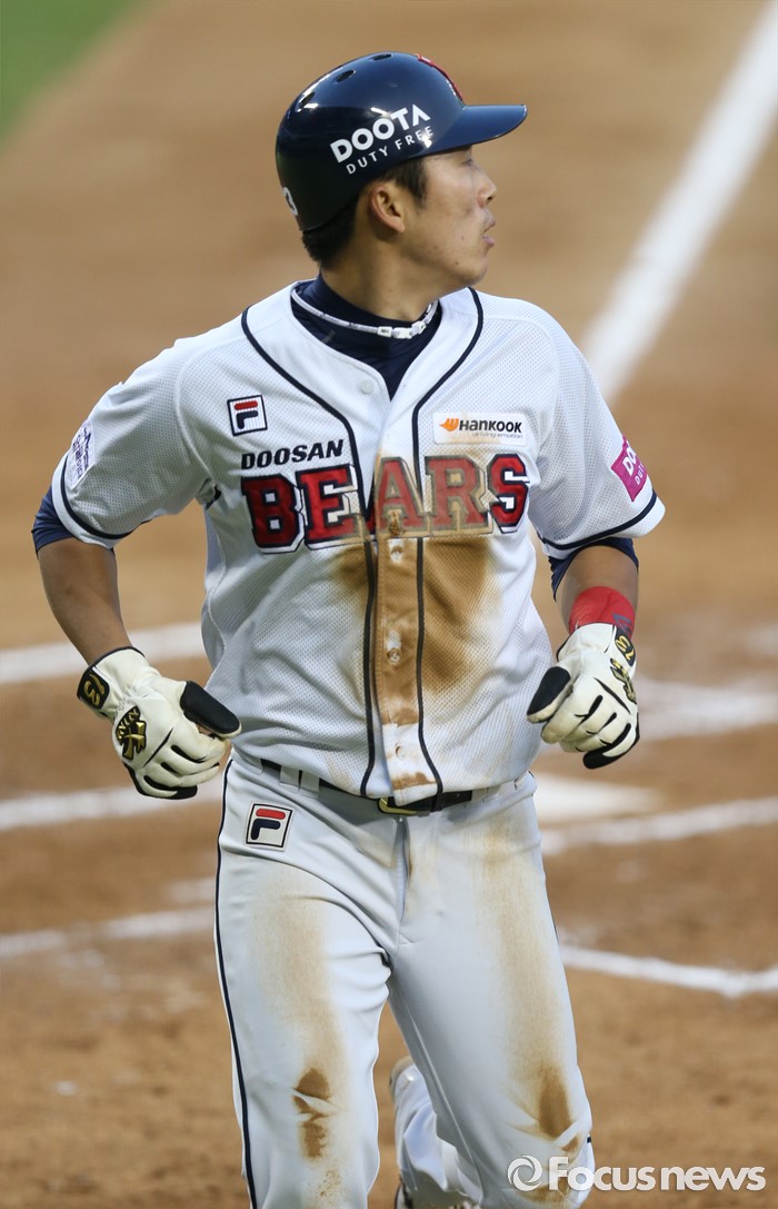 (서울=포커스뉴스) 24일 서울 잠실구장에서 열린 2016프로야구 kt-두산 경기 3회말 우중간 펜스 앞에 떨어지는 3루타를 치고 진루한 두산 허경민이 김재호의 적시타로 홈인하고 있다.