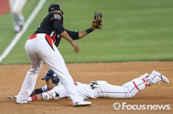 | △ 3루에서 세이프되는 두산 허경민 |