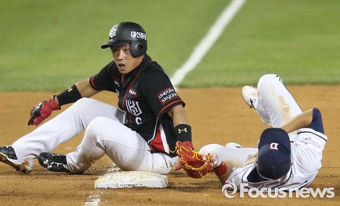 (서울=포커스뉴스) 24일 서울 잠실구장에서 열린 2016프로야구 kt-두산 경기 6회초 1사 1,3루에서 kt 전민수의 2루수 옆 안타때 1루주자 박경수와 두산 3루수 허경민이 충돌해 넘어져 있다.
