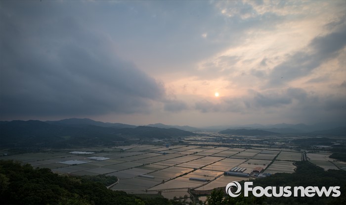 (철원=포커스뉴스) 입하와 소만을 지나 망종으로 향하는 24일 오후 강원도 철원 소이산 전망대에서 바라본 철원평야의 논이 석양에 물들고 있다.