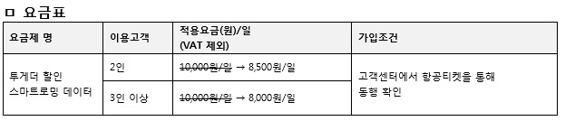 투게더 할인 스마트로밍 데이터는 해외 여행시 동행인과 함께 스마트로밍 데이터 요금제를 신청하면 각각 요금을 1500원에서 최대 2000원까지 할인받아 데이터 로밍을 즐길 수 있다.