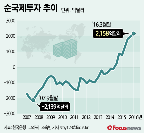 (서울=포커스뉴스) 25일 한국은행이 발표한 ‘3월말 국제투자대조표(잠정)’에 따르면 올 3월 말 기준 순국제투자액은 2,158억달러로 사상최대치를 기록했다.