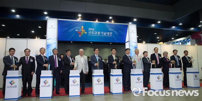 (서울=포커스뉴스) 25일 오전 서울 강남구 코엑스에서 열린 국토교통부 주최'2016 국토교통대전' 개막식에 참석한 강호인(왼쪽 여덟번째) 국토교툥부 장관과 내외빈이 관련 퍼포먼스를 하고 있다.
