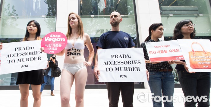 (서울=포커스뉴스) 25일 오후 서울 강남구 프라다매장 앞에서 동물보호단체 케어 관계자들이 프라다 타조 가방에 반대하는 퍼포먼스를 펼치고 있다.