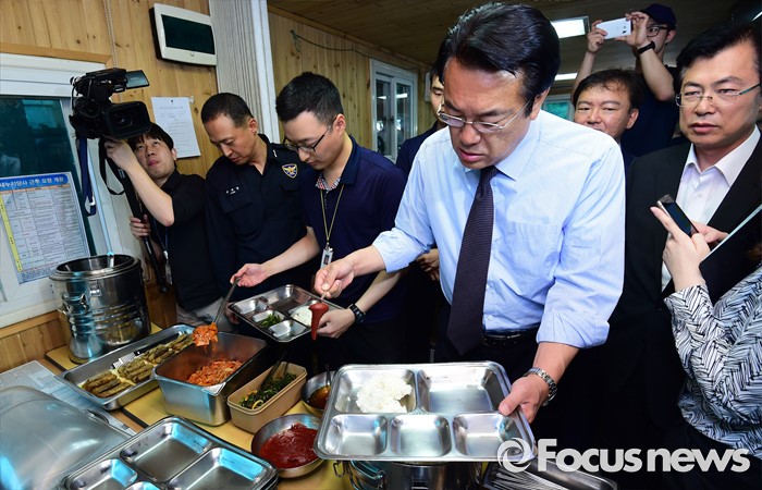 (서울=포커스뉴스) 정진석 새누리당 원내대표가 25일 서울 여의도 당사 앞 경비 의경대를 격려차 방문해 식사를 하기 위해 배식을 하고 있다.