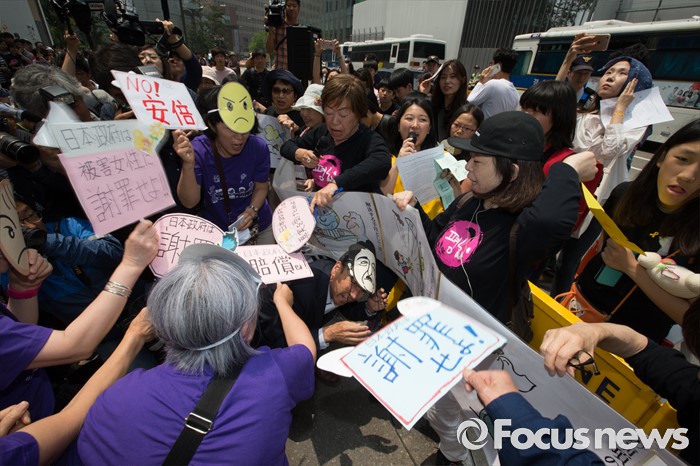 (서울=포커스뉴스) 25일 오전 서울 종로구 옛 일본대사관 앞에서 열린 '제1232차 일본군 위안부 문제해결을 위한 정기 수요시위'에서 일본인들이 김복동(왼쪽), 길원옥 할머니 앞에서 퍼포먼스를 선보이고 있다.