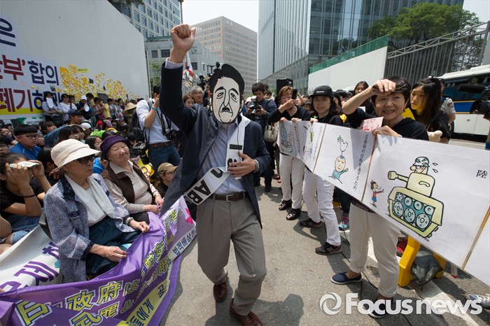 (서울=포커스뉴스) 25일 오전 서울 종로구 옛 일본대사관 앞에서 열린 '제1232차 일본군 위안부 문제해결을 위한 정기 수요시위'에서 일본인들이 김복동(왼쪽), 길원옥 할머니 앞에서 퍼포먼스를 선보이고 있다.