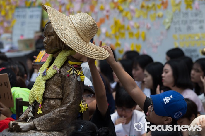 (서울=포커스뉴스) 25일 오전 서울 종로구 옛 일본대사관 앞에서 열린 '제1232차 일본군 위안부 문제해결을 위한 정기 수요시위'에 참석한 학생들이 소녀상의 밀집모자를 씌워주고 있다.