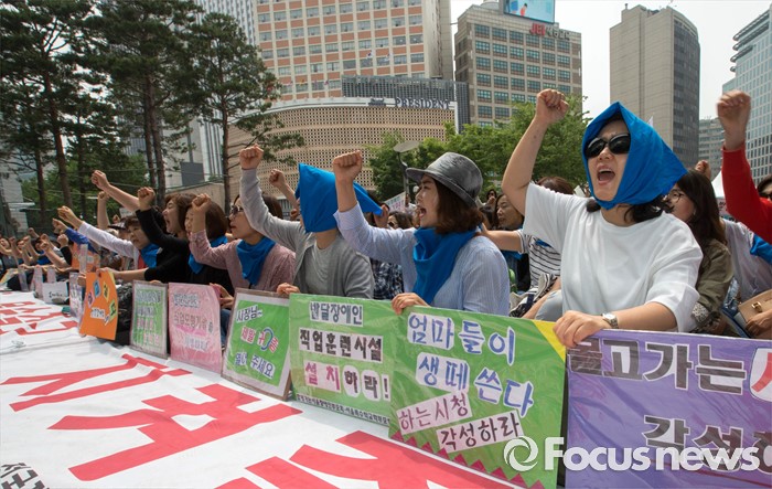 (서울=포커스뉴스) 25일 오전 서울 중구 서울시청 앞에서 열린 발달장애인 종합대책요구 기자회견에 서울시 장애인 부모회 회원들이 구호를 외치고 있다.