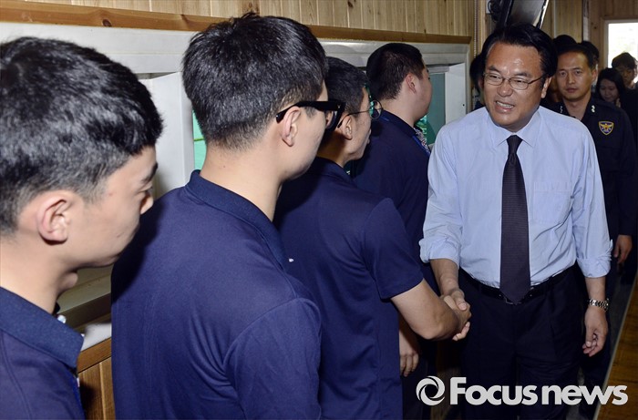 (서울=포커스뉴스) 정진석 새누리당 원내대표가 25일 서울 여의도 당사 앞에서 근무하는 경비중대를 격려 방문해 의경들과 인사하고 있다.