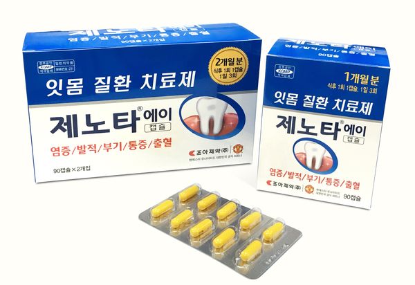 ‘제노타에이캡슐’는 1일 3회, 1회 1캡슐씩 식후에 복용하며 90캡슐 2개입 포장으로 2개월간 복용하면 된다.조아제약이 출시한 잇몸 질환 치료제 제노타에이캡슐 제품. <사진출처=조아제약>