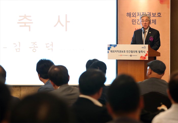 (서울=포커스뉴스) 25일 서울 중구 롯데호텔에서 문화체육관광부가 후원하고 한국저작권위원회가 주관하는 해외저작권 보호 민간협의체 발족식에 참석한 김종덕 문화체육관광부 장관이 축사를 하고 있다. <사진제공=문화체육관광부>