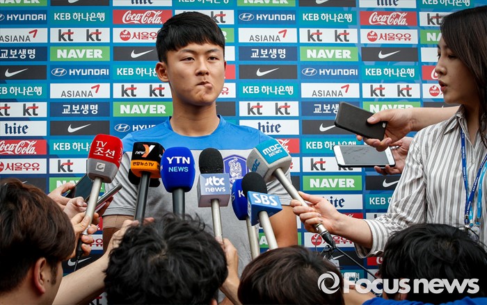 (파주=포커스뉴스) 이승우(18, 바르셀로나 후베닐A)가 25일 오후 경기도 파주 NFC에서 진행된 U-18(18세 이하) 축구대표팀 소집 훈련에 앞서 취재진의 질문에 답하고 있다.