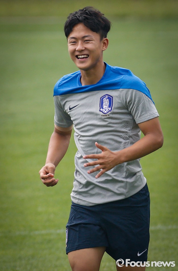 (파주=포커스뉴스) 이승우(18, 바르셀로나 후베닐A)가 25일 오후 경기도 파주 NFC에서 잉글랜드 U18(18세 이하) 대표팀과의 친선전을 앞두고 축구대표팀 선수들과 소집 훈련에 임하고 있다.