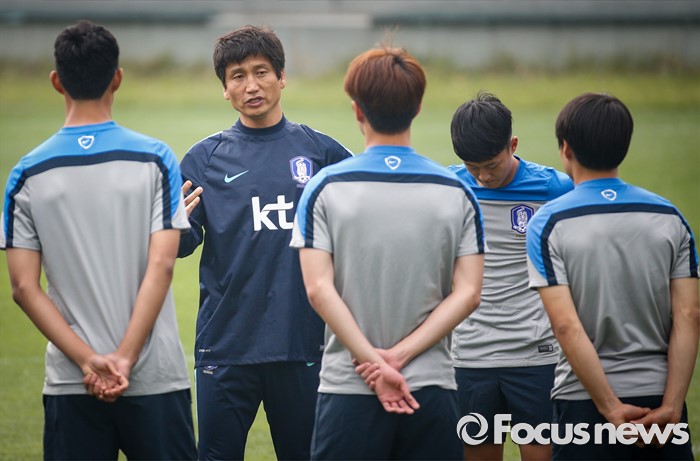 (파주=포커스뉴스) 25일 오후 경기도 파주 NFC에서 진행된 U-18(18세 이하) 축구대표팀 소집 훈련에 참석한 정정용 감독이 선수들과 대화하고 있다.