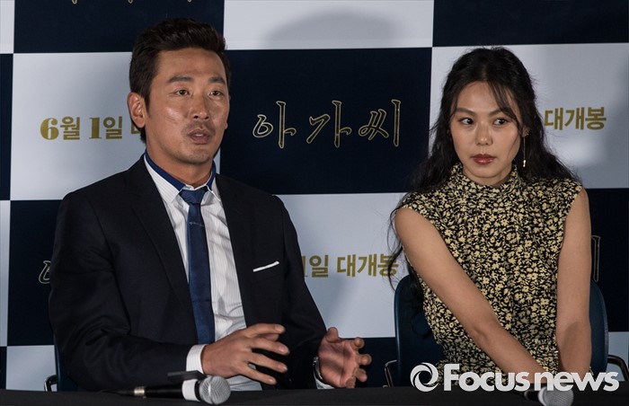(서울=포커스뉴스) 25일 오후 서울 성동구 왕십리 CGV에서 열린 영화 '아가씨' 언론시사회에 참석한 배우 하정우(왼쪽)와 김민희가 대화를 나누고 있다.