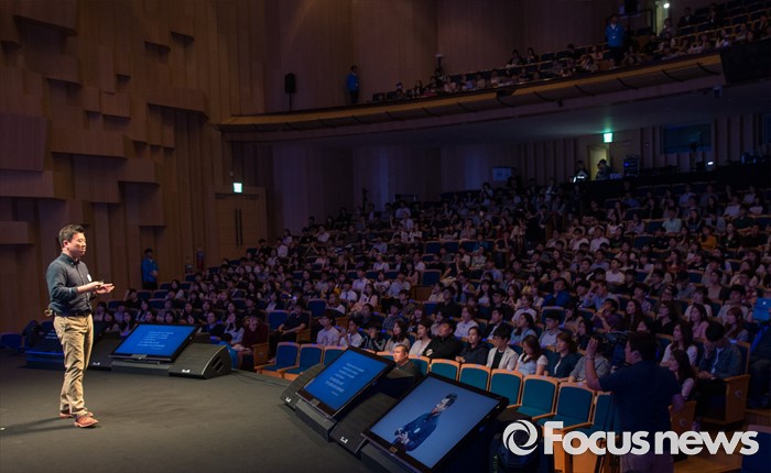 (서울=포커스뉴스) 25일 오후 서울 서대문구 연세대학교에서 열린 삼성 퀴즈 콘서트 '청춘門답'에 참석한 조용범 페이스북코리아 사장이 기조강연을 하고 있다.