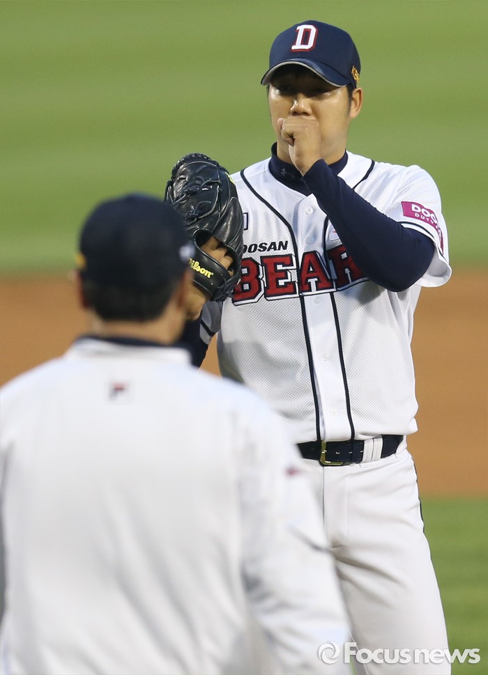 (서울=포커스뉴스) 25일 서울 잠실구장에서 열린 2016프로야구 kt-두산 경기 1회초 두산 선발 장원준이 난조에 빠지자 한용덕 투수 코치가 마운드로 올라가고 있다.