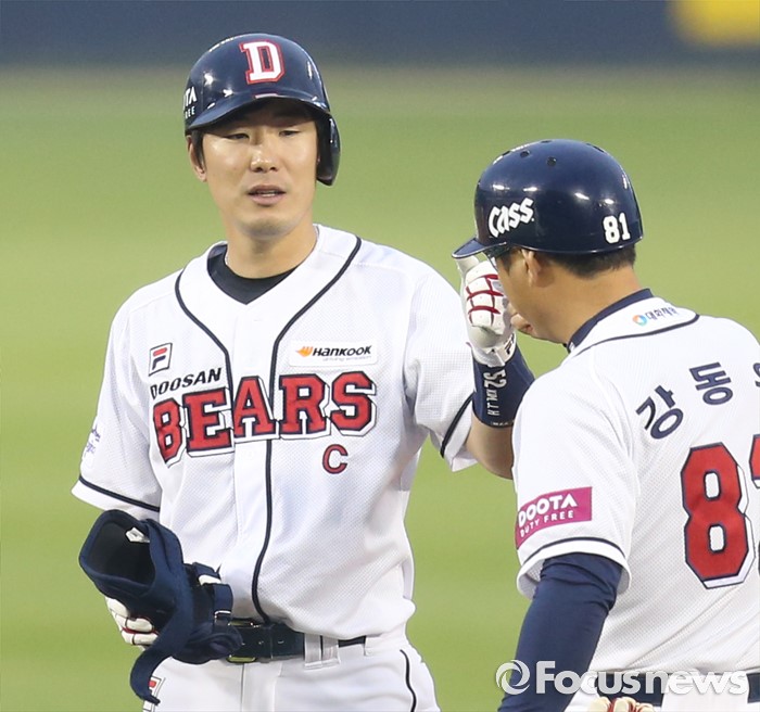 (서울=포커스뉴스) 25일 서울 잠실구장에서 열린 2016프로야구 kt-두산 경기 2사 1,3루에서 두산 김재호가 중견수 뒤로 빠지는 역전 2타점 2루타를 치고 강동우 코치의 축하를 받고 있다.