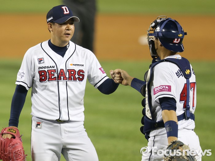 (서울=포커스뉴스) 25일 서울 잠실구장에서 열린 2016프로야구 kt-두산 경기에서 9회 등판해 두산의 승리를 지킨 마무리 투수 이현승이 포수 양의지와 주먹을 마주치고 있다.