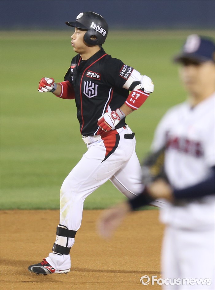 (서울=포커스뉴스) 25일 서울 잠실구장에서 열린 2016프로야구 kt-두산 경기 7회초 kt 오정복이 두산의 바뀐 투수 오현택을 공략해 좌월 솔로 홈런을 치고 그라운드를 돌고 있다.