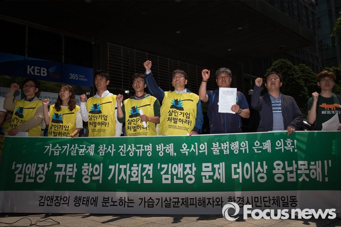 가습기살균제피해자와가족모임, 환경보건시민센터 등은 지난 17일 서울 종로구 내자동 김앤장 법률사무소 앞에서 기자회견을 열고 가습기 살균제 독성실험 개입논란에 대한 진실 규명을 요구했다.