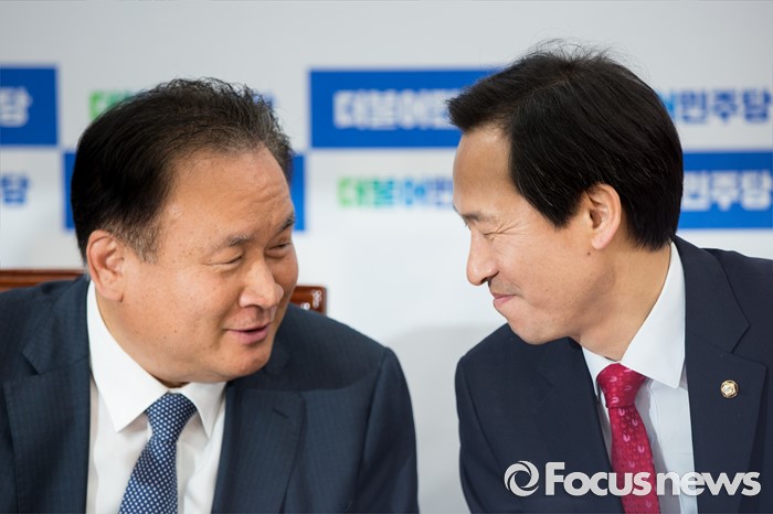 (서울=포커스뉴스) 우상호(오른쪽) 더불어민주당 원내대표가 이상민 더불어민주당 청년일자리TF 위원장이 26일 오전 서울 여의도 국회에서 열린 '청년일자리 TF회의'에 참석해 대화를 나누고 있다.