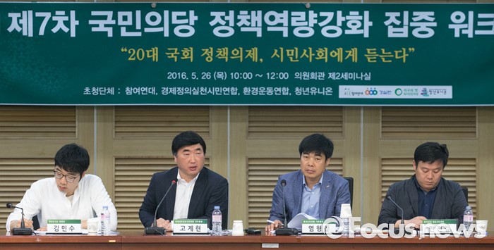 (서울=포커스뉴스) 26일 오전 서울 여의도 국회 의원회관에서 열린 국민의당 7차 정책역량강화 집중 워크숍에 참석한 시민사회단체 관계자들이 발언하고 있다. 왼쪽부터 김민수 청년유니온 위원장, 고계현 경제정의실천시민연합 사무총장, 염형철 환경운동연합 사무총장, 안진걸 참여연대 협동사무처장.
