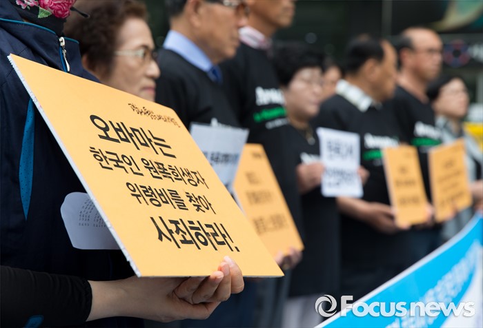 (서울=포커스뉴스) 26일 오전 서울 종로구 광화문 KT 앞에서 한국 원폭피해자와 시민사회단체가 오바마 미국 대통령의 한국 원폭 피해자들에 대한 공식 인정과 조사 및 사죄 촉구 기자회견을 하고 있다.