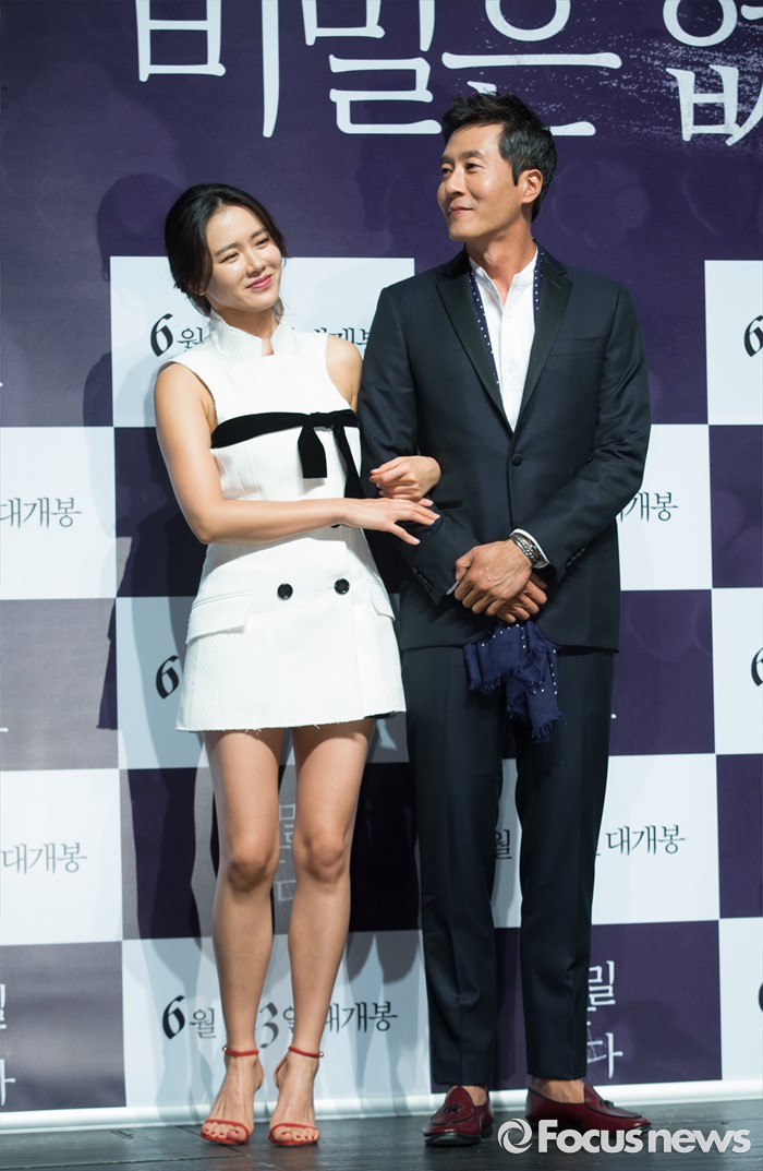 (서울=포커스뉴스) 26일 오전 서울 강남구 압구정 CGV에서 열린 영화 '비밀은 없다' 제작보고회에 참석한 배우 손예진(왼쪽)과 김주혁이 포토타임을 갖고 있다.