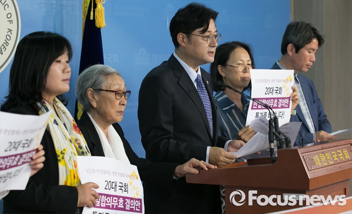 (서울=포커스뉴스) 26일 오전 서울 여의도 국회 정론관에서 홍익표, 이인영 더불어민주당 의원과 윤미향 한국정신대문제대책협의회 상임대표, 위안부 피해자 김복동 할머니 등이 한일 일본군 '위안부' 합의 무효 및 재협상을 위한 20대 국회의 역할 촉구 기자회견을 하고 있다.