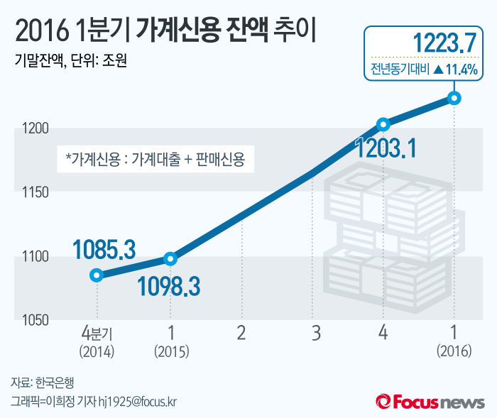 (서울=포커스뉴스) 26일 한국은행이 공개한 ‘2016년 1분기 가계신용’ 통계에 따르면올 1분기 가계신용 잔액은 1223조7000억원으로 역대 최고치를 기록했다.