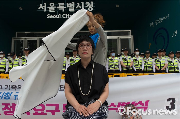 (서울=포커스뉴스) 26일 오전 서울시청 정문앞에서 전국장애인 부모연대와 서울특수학교학부모협의회원들이 발달장애인 정책 수립을 촉구하며 삭발식을 하고 있다.