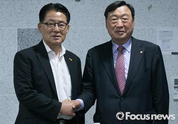 (서울=포커스뉴스) 박지원(왼쪽) 국민의당 원내대표가 26일 오후 서울 여의도 국회 의원회관에서 이희범 평창동계올림픽 조직위원장과 만나 면담에 앞서 인사하고 있다.