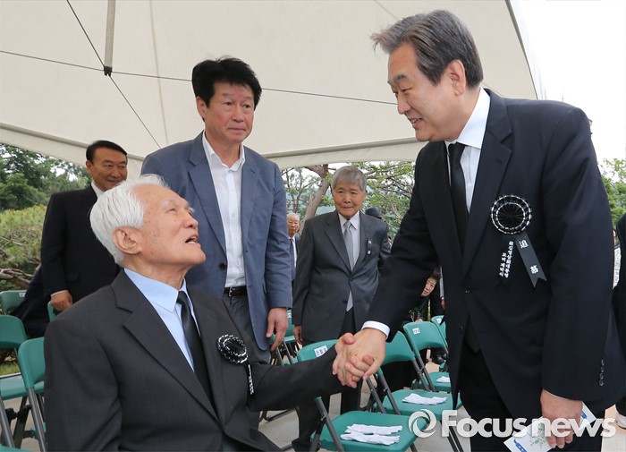 (서울=포커스뉴스) 26일 오후 서울 동작구 국립현충원에서 열린 고 김영삼 전 대통령 묘비 제막식에서 김무성(오른쪽) 전 새누리당 대표가 최형우 전 의원과 인사를 나누고 있다.
