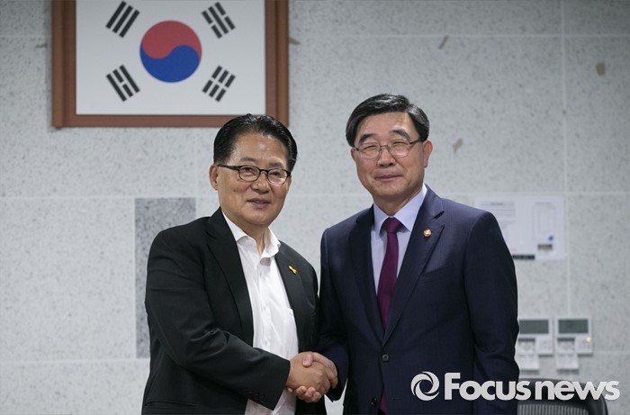 (서울=포커스뉴스) 박지원(왼쪽) 국민의당 원내대표가 26일 오후 서울 여의도 국회 의원회관에서 이기권 고용노동부 장관과 면담에 앞서 인사하고 있다.