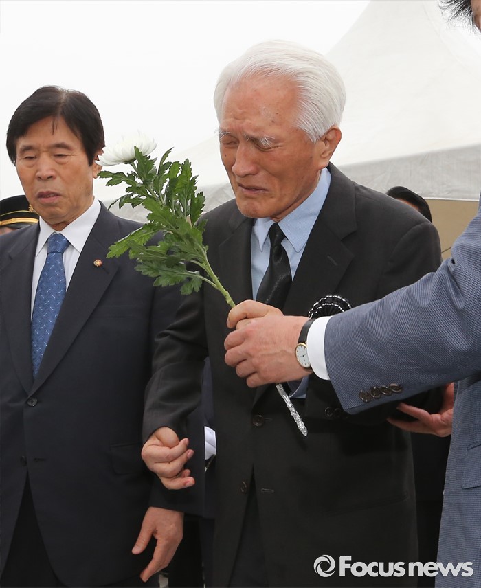 (서울=포커스뉴스)26일 오후 서울 동작구 국립현충원에서 열린 고 김영삼 전 대통령 묘비 제막식에서 최형우 전 의원이 눈물을 흘리고 있다.