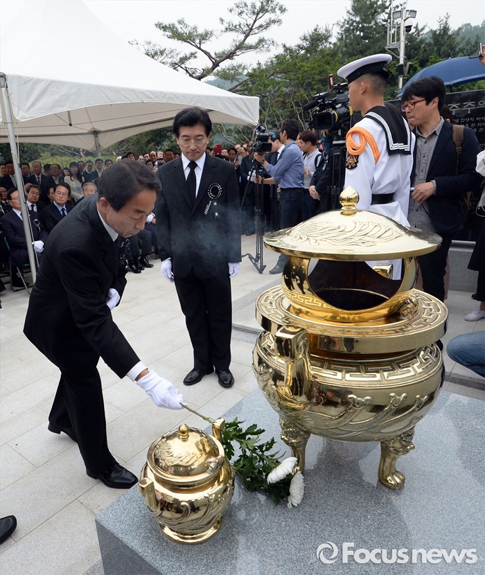 (서울=포커스뉴스) 26일 오후 서울 동작구 국립현충원에서 열린 고 김영삼 전 대통령 묘비 제막식에서 고 김 전 대통령의 차남 김현철씨가 헌화 및 분향을 하고 있다.