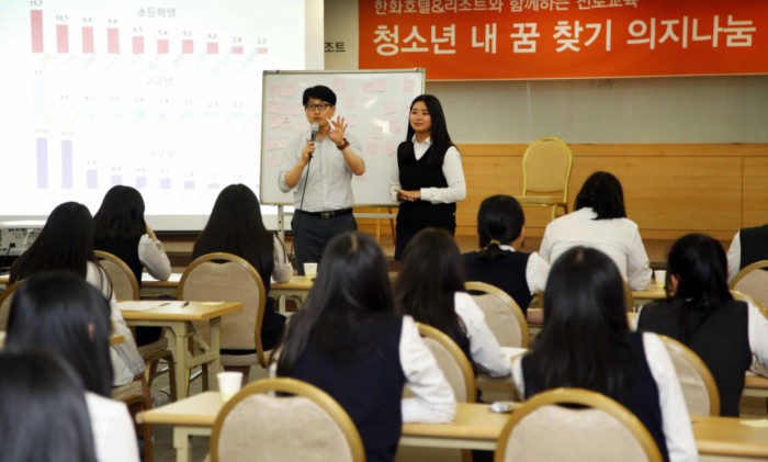 또한 기업 최초로 문화재청과 '한문화재 한지킴이 운동' 협약을 체결해 리조트 소재 지역의 문화재지킴이 활동과 청소년·취약계층을 대상으로 문화예술교육 등 다양한 지역밀착형 사회공헌활동을 지속해오고 있다.지난 18일 속초여중에서 '의지나눔' 프로젝트의 일환으로 진로설계 특강이 진행되고 있다.<사진제공=한화호텔앤드리조트>