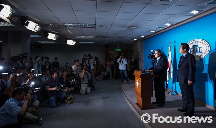 (서울=포커스뉴스) 새누리당 임시지도부인 혁신비상대책위원회 위원장에 내정된 김희옥(오른쪽 두 번째) 전 정부공직자윤리위원장이 26일 오후 서울 여의도 국회에서 혁신비대위 계획을 발표 하고 있다. 김 위원장 내정자 오른쪽은 정진석 새누리당 원내대표.
