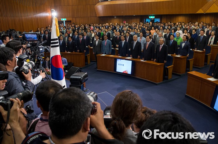 (서울=포커스뉴스) 26일 오후 서울 여의도 국회 헌정기념관에서 열린 '새한국의 비전' 창립 기념식에서 정의화 국회의장, 박관용 전 국회의장, 김종인 더불어민주당 비상대책위 대표, 천정배 국민의당 공동대표 및 참석자들이 국민의례를 하고 있다.