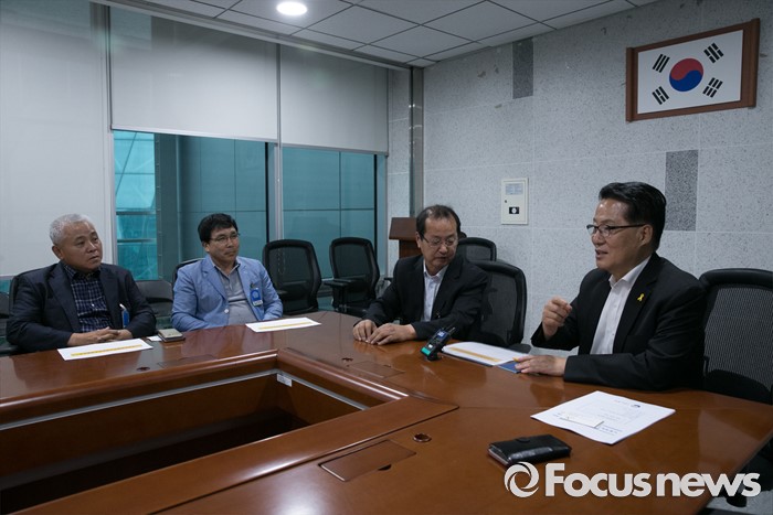 (서울=포커스뉴스) 박지원(오른쪽 첫번째) 국민의당 원내대표가 26일 오후 서울 여의도 국회 의원회관 의원실에서 개성공단 입주기업 협력업체 대표단과 만나 면담을 하고 있다.