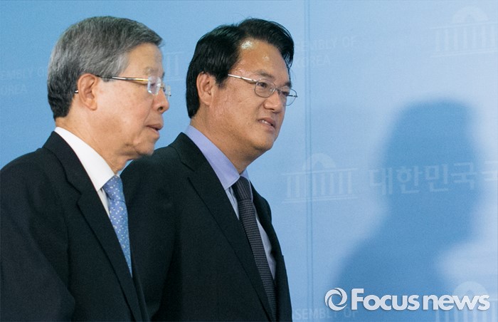 (서울=포커스뉴스) 새누리당 혁신비대위원장에 내정된 김희옥(왼쪽) 전 동국대 총장과 정진석 원내대표가 26일 오후 서울 여의도 국회 정론관에서 기자회견을 위해 입장하고 있다.