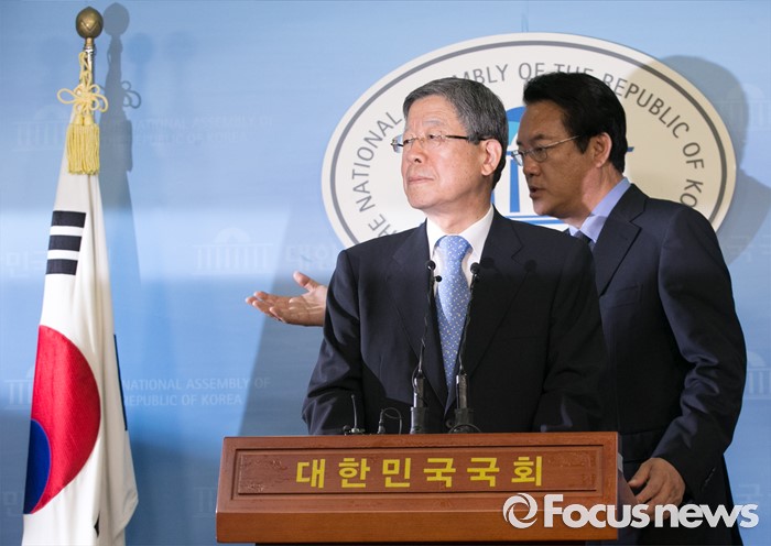 (서울=포커스뉴스) 새누리당 혁신비대위원장에 내정된 김희옥(왼쪽) 전 동국대 총장과 정진석 원내대표가 26일 오후 서울 여의도 국회 정론관에서 기자회견을 마친 뒤 취재진 질문에 답하기 위해 이동하고 있다.