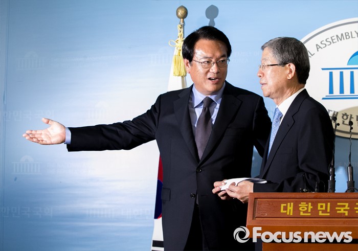 (서울=포커스뉴스) 새누리당 혁신비대위원장에 내정된 김희옥(오른쪽) 전 동국대 총장과 정진석 원내대표가 26일 오후 서울 여의도 국회 정론관에서 기자회견을 마친 뒤 취재진 질문에 답하기 위해 이동하고 있다.