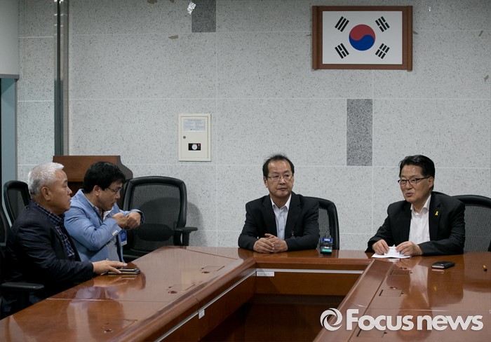(서울=포커스뉴스) 박지원(오른쪽 첫번째) 국민의당 원내대표가 26일 오후 서울 여의도 국회 의원회관 의원실에서 개성공단 입주기업 협력업체 대표단과 만나 면담을 하고 있다.