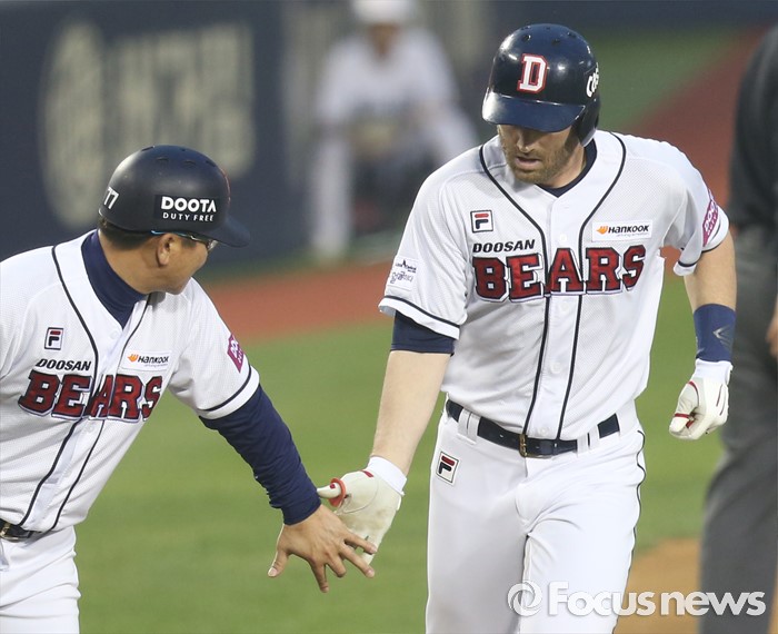 (서울=포커스뉴스) 26일 서울 잠실구장에서 열린 2016프로야구 kt-두산 경기 3회말 1사후 두산 에반스가 좌월 솔로 홈런을 치고 3루를 돌며 전형도 코치와 손바닥을 마주치고 있다.