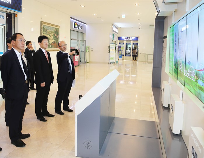 (나주=포커스뉴스) 우태희 산업통상자원부 2차관이 26일 전남 나주혁신도시에 위치한 한국전력공사 본사를 방문해, 김시호 한전 부사장의 안내로 재난종합상황실과 스마트그리드 홍보관 등 주요 시설을 둘러보고, 에너지신산업 시장 확대를 위해 한전이 추진 중인 투자 프로젝트(신산업 펀드 조성, 전기차 충전소, AMI 보급, 빅데이터센터 개설, 주파수 조정용 ESS 설치 등)의 진행 및 추진현황을 점검하고 있다. <사진제공=산업통상자원부>