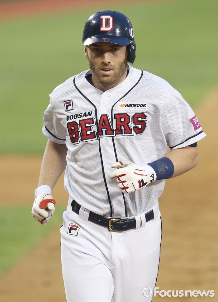 (서울=포커스뉴스) 26일 서울 잠실구장에서 열린 2016프로야구 kt-두산 경기 3회말 1사후 두산 에반스가 좌월 솔로 홈런을 치고 3루를 돌아 홈으로 들어오고 있다.