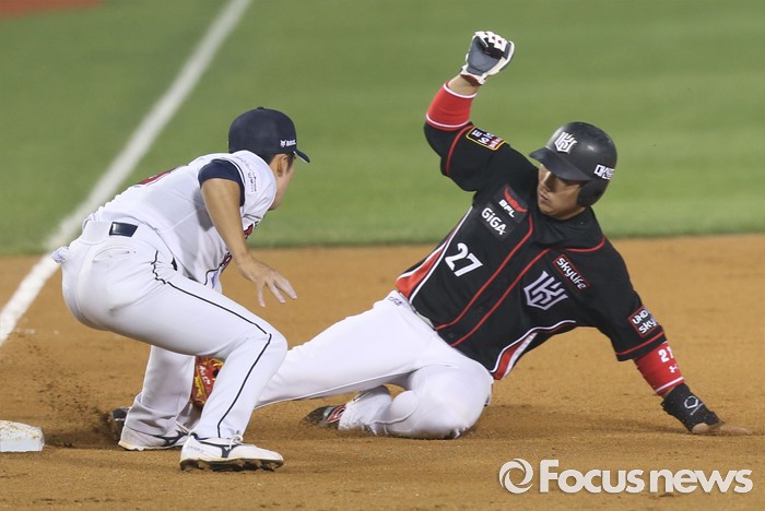(서울=포커스뉴스) 26일 서울 잠실구장에서 열린 2016프로야구 kt-두산 경기 5회초 무사 1,2루에서 kt 김상현의 유격수앞 땅볼때 2루주자 오정복이 3루에서 두산 3루수 허경민에게 태그 아웃되고 있다.